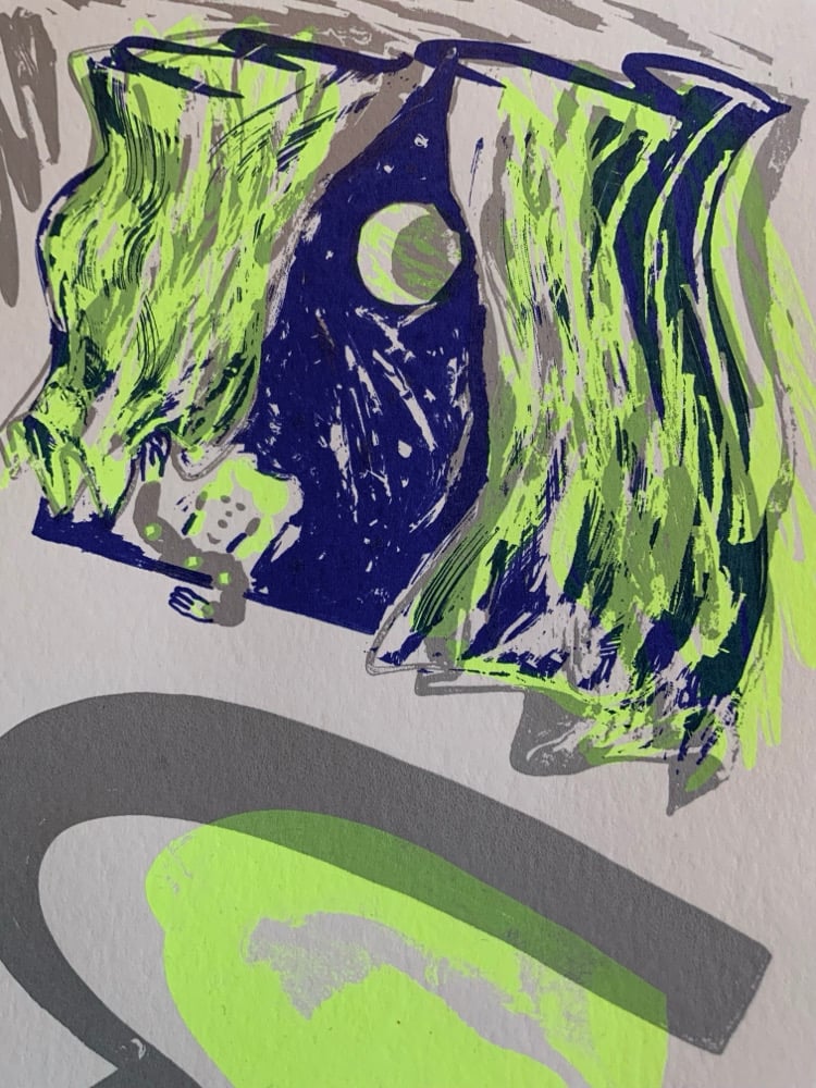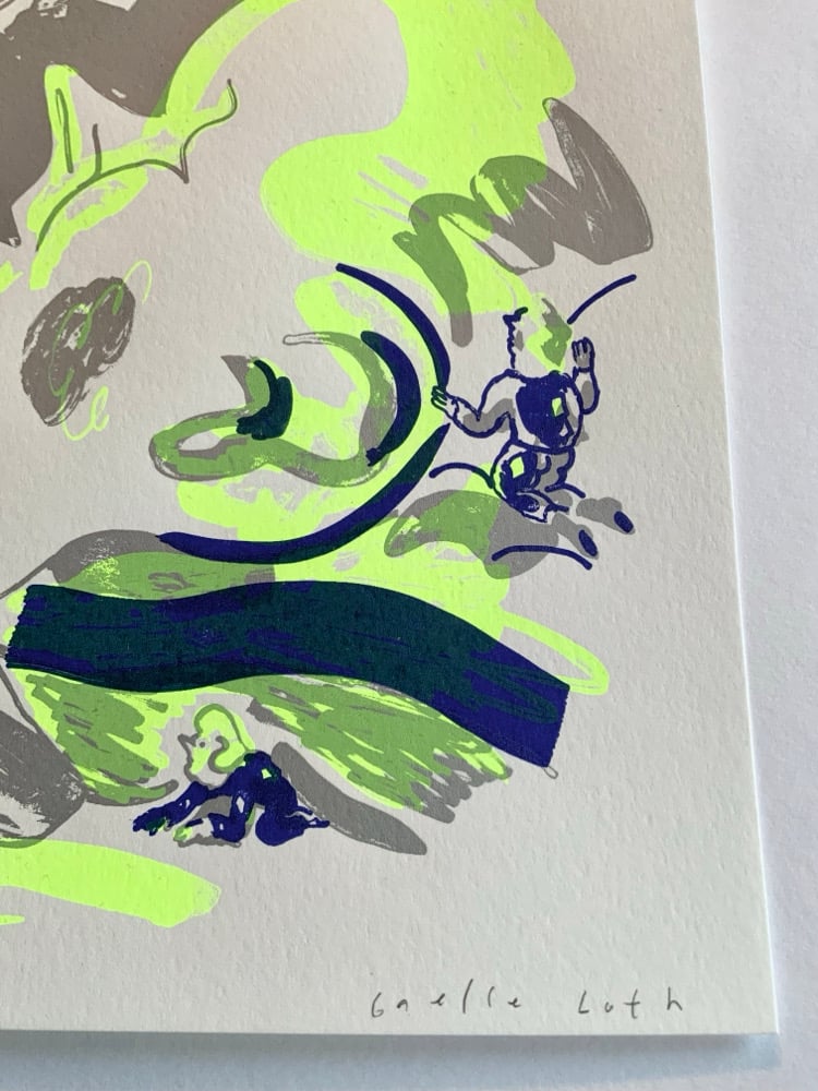 Sérigraphie 3 passages : argenté, bleu, jaune fluo pâle de Gaelle Loth Format A3 (29,7x42cm) 45 exemplaires numérotés signés Papier Fedrigoni Arena blanc 300gr